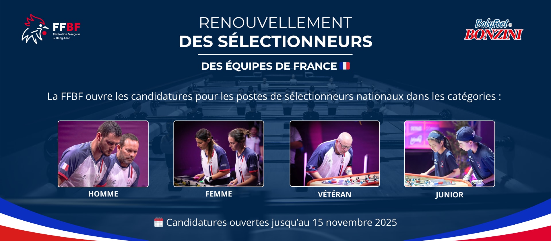 La Fédération Française de Baby-Foot lance le processus de renouvellement des sélectionneurs nationaux pour les différentes catégories des Équipes de France : Homme, Femme, Vétéran et Junior.