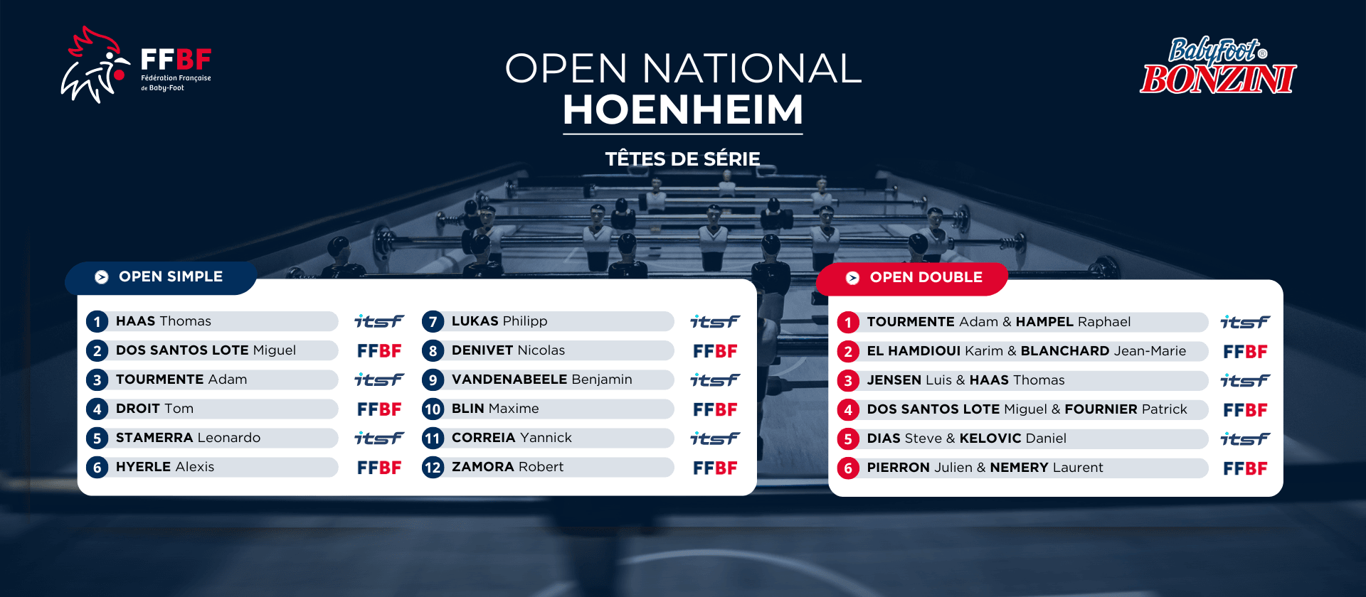 Nous sommes heureux de vous annoncer les têtes de série pour les compétitions Open Simple et Open Double de l'Open National de Hoenheim classé ITSF 500 !